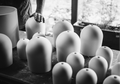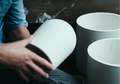 In onze kleine fabriek verwerken we het verzamelde gips met een innovatief proces waarbij we druk gebruiken. Hierdoor wordt het materiaal herbruikbaar en vormen we het tot de Archy light pendels.
